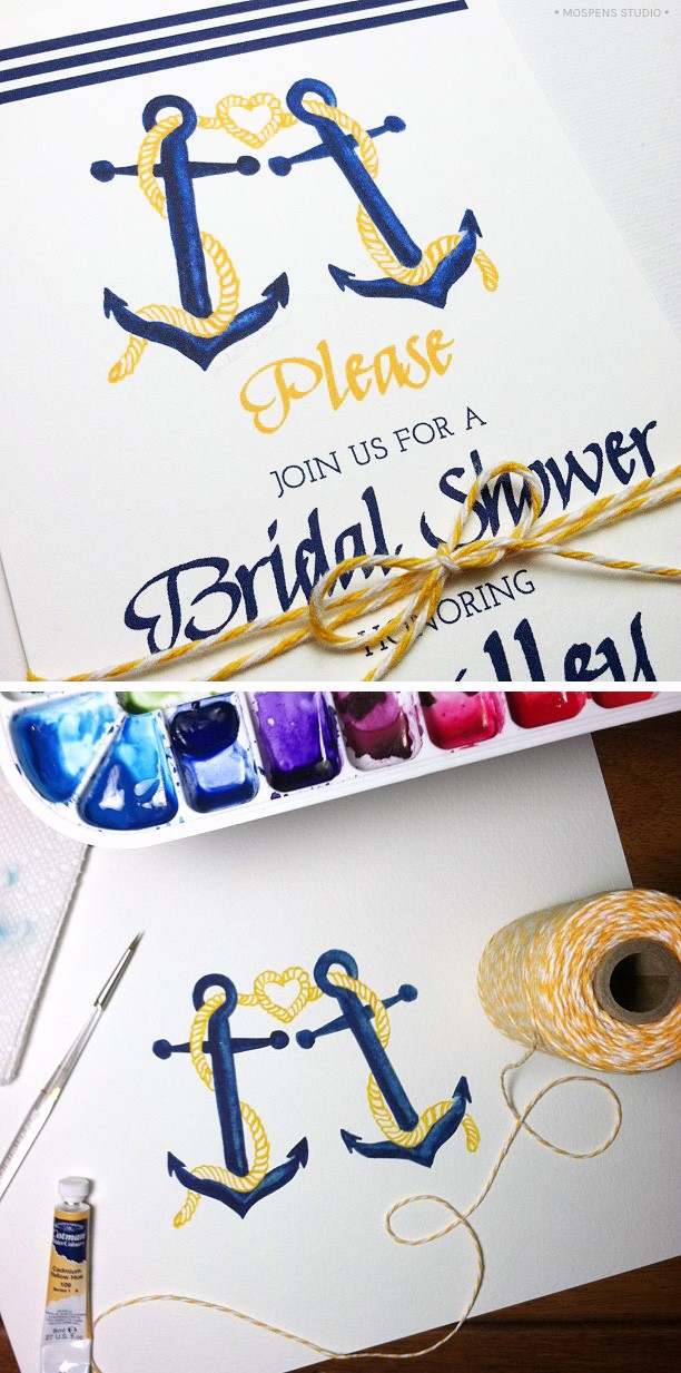 Kelley’s nautical bridal shower invitations were custom designed with navy watercolor anchors adorning yellow rope, and matching yellow twine was wrapped around each invite.