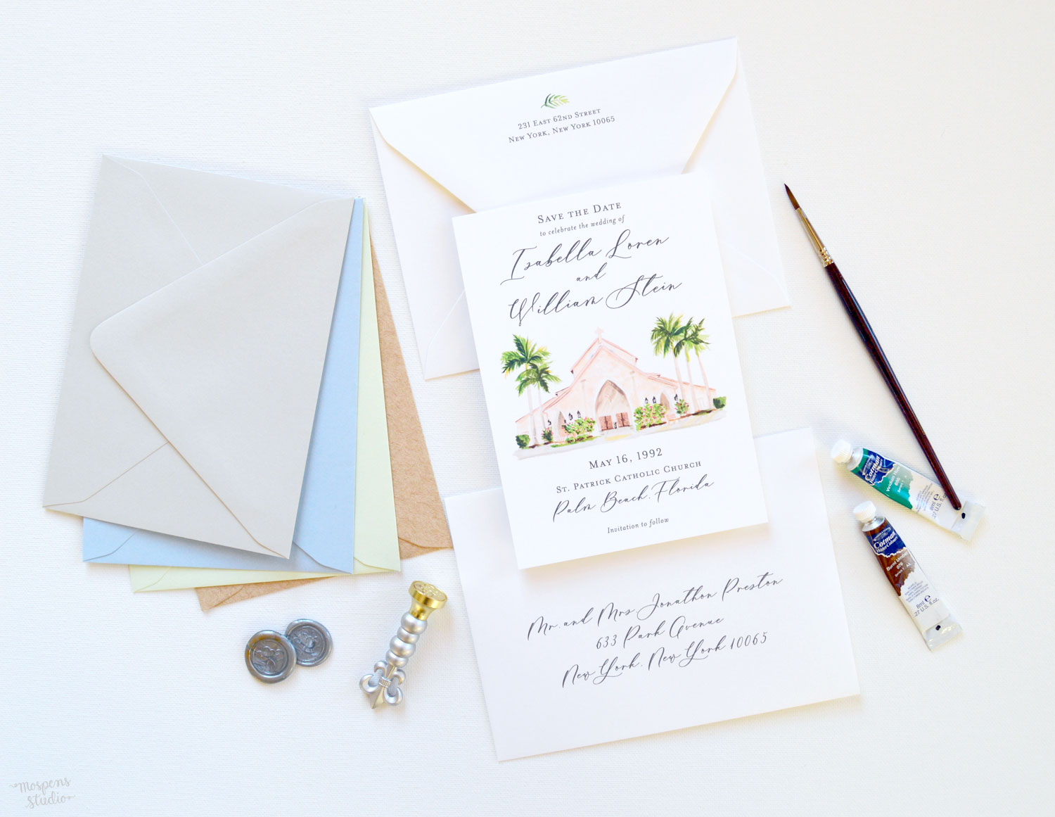 Mospens Studio is a husband-and-wife owned and operated design studio creating custom wedding invitations and stationery. Each venue save the date design first begins with Michelle Mospens 100% original hand-painted watercolor artwork. Next all stationery is printed in-house by James Mospens.